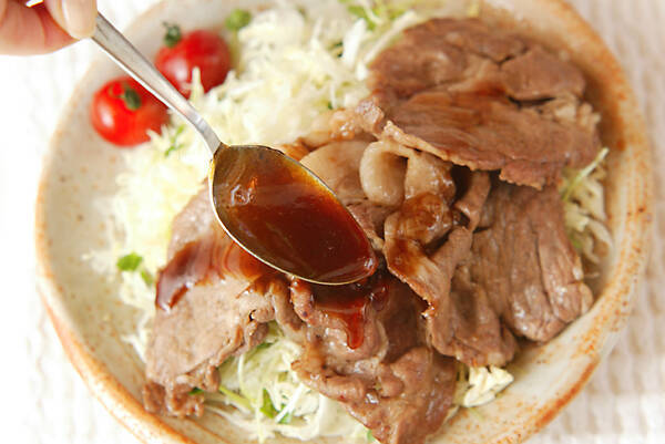 器に貝割れ菜と合わせたキャベツを敷き、4を盛る。タレが残っていたら少し煮詰めて豚ロース肉にかけ、プチトマトを添える。