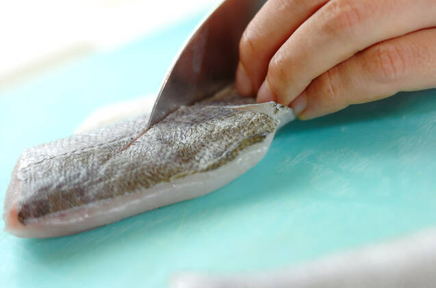 スズキは身の厚い部分に十字に切り込みを入れ、両面に塩を振る。