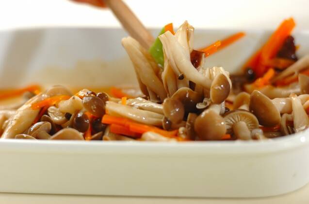 鍋に湯を沸かし、シイタケとシメジ、ニンジンをゆでて水気をきり、冷ます。ドレッシングで和える。