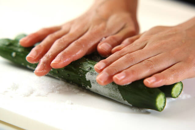 キュウリは両端を切り落とし、まな板に置き分量外の塩をかけ手のひらでコロコロ転がし(板ずり)、水洗いする。水気をきってすりこ木、またはビン等でキュウリを軽く叩き、食べやすい大きさに割る(種が多い場合は種の部分だけを取り除く)。