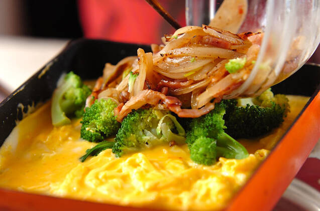 <卵液>の材料をよく混ぜ合わせ、サラダ油をひいた卵焼き器を中火で熱し、卵液の1/3量を流し入れ菜ばしで軽く混ぜ、半熟になったら(1)をのせて半分折りに重ね、向こう側に滑らせる。