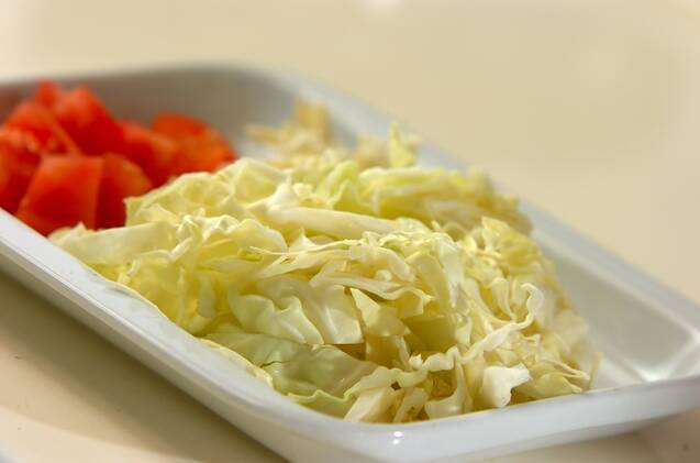 キャベツは芯を切り落とし、芯は斜め薄切りにする。葉の部分は細切りにする。トマトはヘタを除き、2cm角に切る。