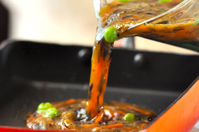 (1)の粗熱が取れたら、卵液に汁ごと加えて混ぜ合わせる。グリンピースも加えて混ぜる。卵焼き器を中火で熱し、サラダ油をひく。卵液の1/4量を流し入れ、巻く様に向こう側に寄せる。
