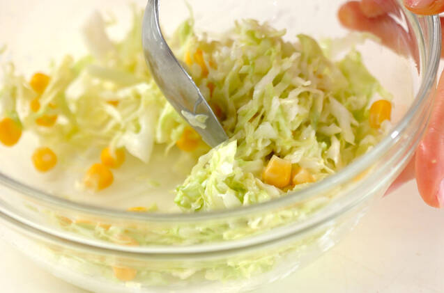 (1)に水煮コーンと<調味料>の材料を加え、混ぜ合わせる。