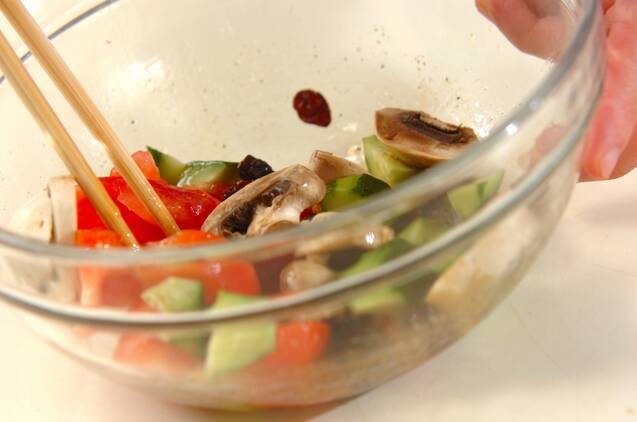 <ドレッシング>のボウルにトマト、キュウリ、マッシュルーム、レーズン(ラム酒ごと)を加え、混ぜ合わせる。