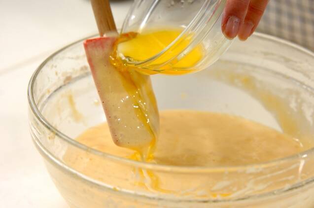 <粉類>の材料を振るい入れて、切り混ぜる。粉が見えなくなったら、<バター液>をゴムベラに伝わせて、まわし入れる。ツヤが出て、リボン状になるまで切り混ぜる。