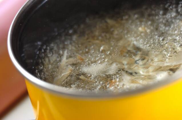 熱湯に分量外の酢を入れて新ゴボウをゆで、ザルに上げる。