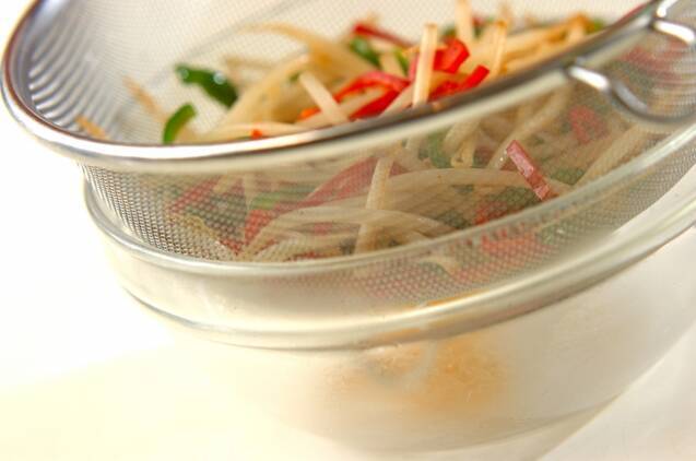 フライパンに1/3量のサラダ油を強火で熱し、モヤシ、ピーマン、赤ピーマンを軽く炒め合わせて塩コショウ、しょうゆで味を調え、汁気をきって器に盛る。