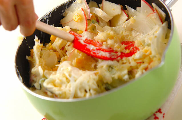 玉ネギ、キュウリ、水煮コーンを加えて全体に混ぜ合わせ、さらにリンゴ、マヨネーズ、プレーンヨーグルトを加えてサックリ混ぜ合わせ、器に盛る。