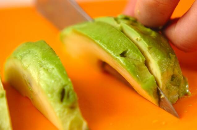 マグロの両面に塩コショウを振る。ニンニクは薄切りにする。アボカドは種を取って皮をむき、1cm幅に切る。
