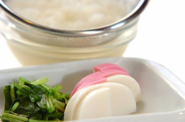 大根おろしはザルに上げ、水気を軽くきる。カマボコは縦半分に切る。ミツバは熱湯でゆでて水に取り、水気を絞り、長さ2cmに切る。