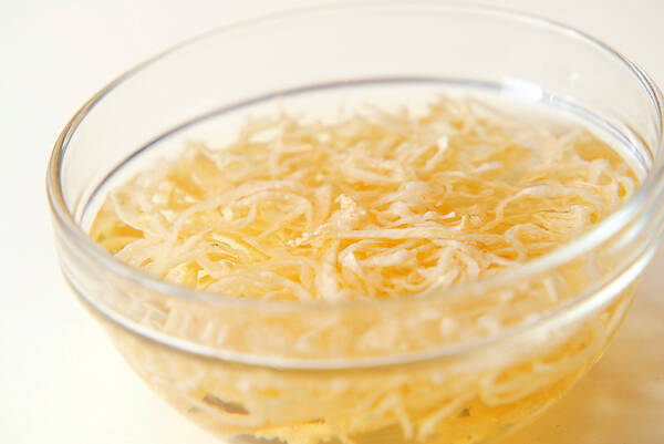 切干し大根はサッと洗って、タップリの水に10分つけ、水気を絞り、長い場合は食べやすい長さにザク切りにする。