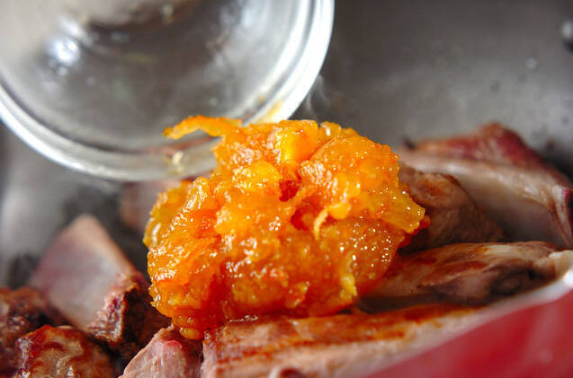 両面にこんがり焼き色がついたら、ママレード、オレンジジュース、しょうゆ、ニンニクを加え、蓋をして中火で途中裏返しながら15分焼く。