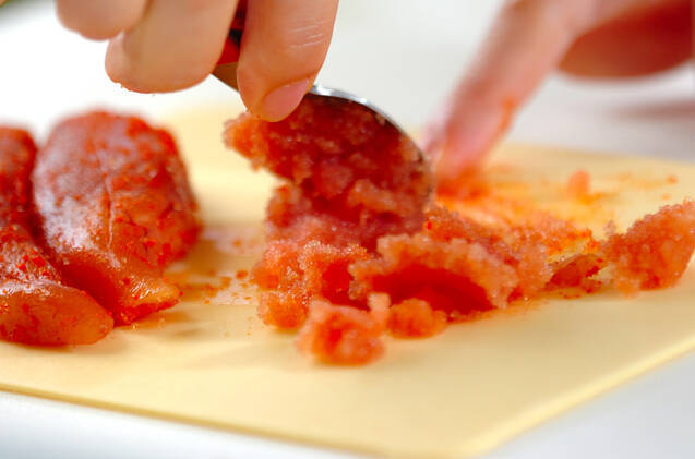明太子は薄皮に切り込みを入れ、スプーンなどで中身をしごき出す。