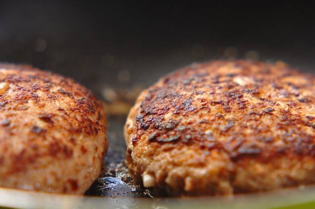 フライパンにサラダ油を強火で熱し、ハンバーグを並べ入れ、両面をそれぞれ40秒程焼いて焼き色を付け、うまみを封じ込める。
