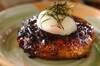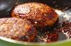 (4)のフライパンに<タレ>の材料を加えて少し煮詰め、ハンバーグを戻し入れてからめる。