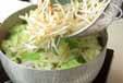 鍋にたっぷりのお湯を沸かし、モヤシ、キャベツ、玉ネギ、ニンジンを入れ、サッとゆでてザルに上げる。