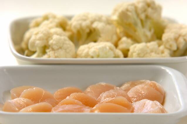 ホタテは横半分にスライスする。カリフラワーは小房に分け、食べやすい大きさに切る。