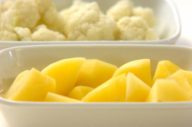 カリフラワーと水気をきったジャガイモは耐熱容器に入れ、ラップをかけて電子レンジで3~5分加熱する。粗熱が取れたら冷蔵庫で冷やす。