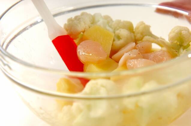 <ハニーレモンドレッシング>のボウルにホタテ、カリフラワー、ジャガイモを入れて和え、マッシュルーム、カマンベールチーズと共に器に盛る。ピンクペッパーとディルを飾る。