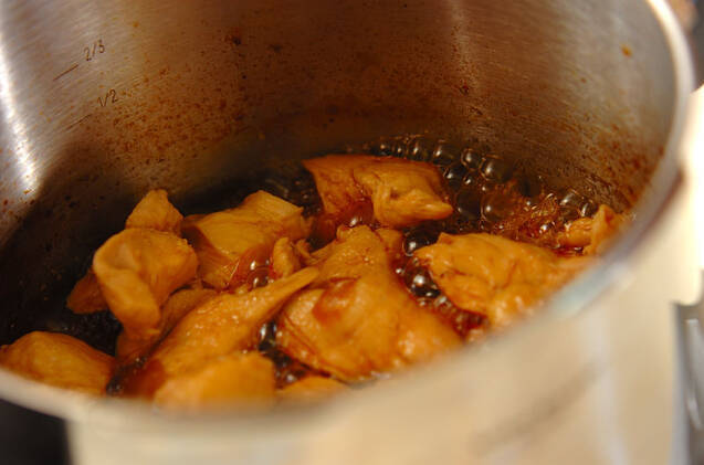 蓋をあけ<調味料>の材料を加えて煮汁がほぼなくなるまで煮る。