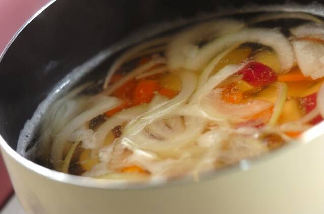 鍋にサツマイモ、玉ネギ、ニンジン、だし汁を入れ、中火で具が柔らかくなるまで10分程煮る。