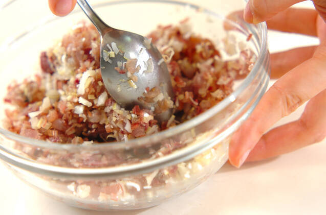 白ネギ、ショウガ、ミョウガを加えて軽く混ぜ、大葉をしいた器に盛る。