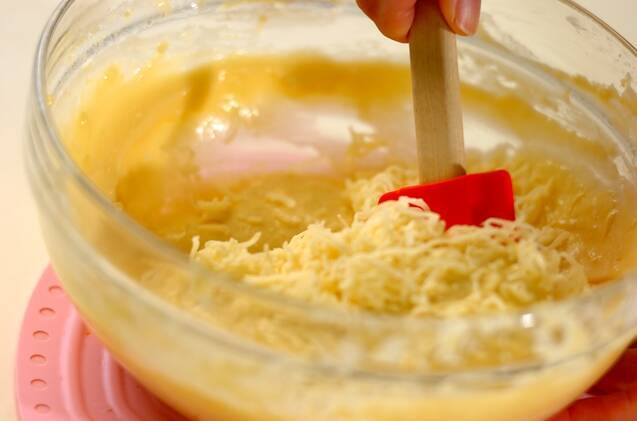 ボウルに<生地>の材料をすべて入れ、泡立て器で混ぜる。生地が滑らかになったらピザ用チーズを加えて混ぜ合わせる。
