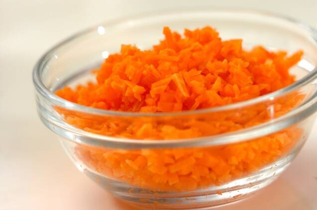 お米は炊く30分以上前に水洗いし、ザルに上げておく。ニンジンは皮をむき、みじん切りにする。