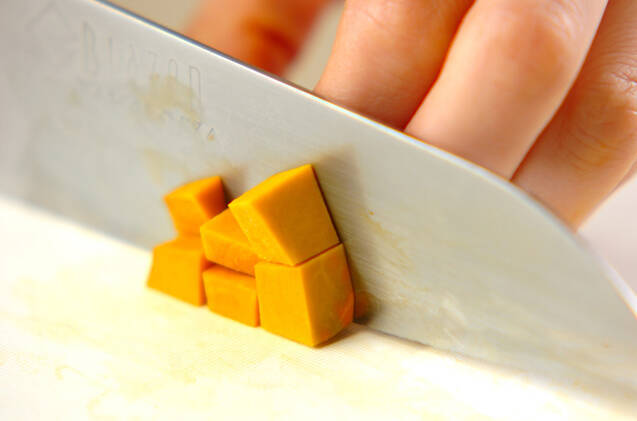 カボチャは種とワタを取り、皮を削ぎ落として1cm角に切る。