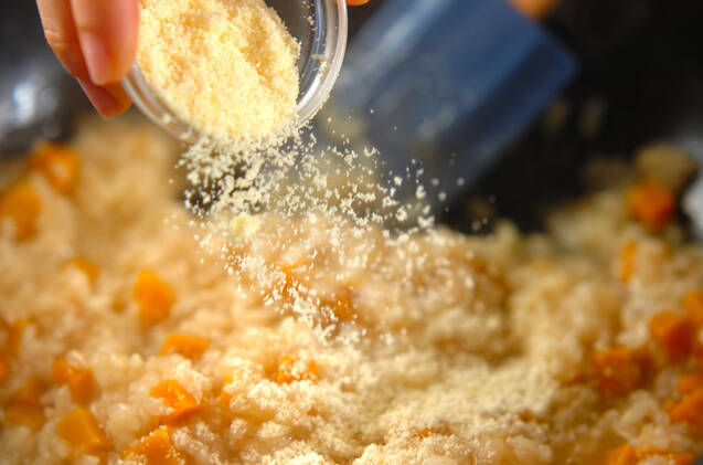 塩コショウで味を調え、最後に粉チーズを加えて全体に混ぜ合わせる。器に盛り、バジルを振る。