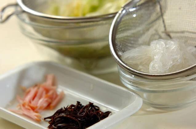 春雨は熱湯につけて柔らかくもどし、ザルに上げて食べやすい長さに切る。