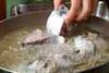 イサキに塩少々を振り掛け、小麦粉を全体につけ、170℃の揚げ油に入れる。