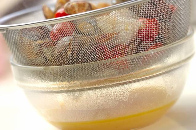 アサリの口が開いたら弱火で5分蒸し煮にし、火を止めて具と蒸し汁に分ける。アサリは6個を飾り用に取っておく。