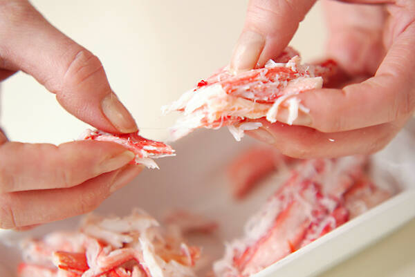 カニ身はなんこつを取り、粗くほぐす。マッシュルームは石づきを切り落とし、汚れを拭き取ってみじん切りにする。玉ネギはみじん切りにする。固ゆで卵は細かく刻む。