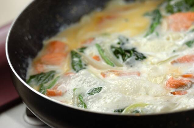 (2)にスモークサーモンとホウレン草を加え、サッと炒める。白ワインを振って<ソース>の材料を加え、ひと煮たちさせる。