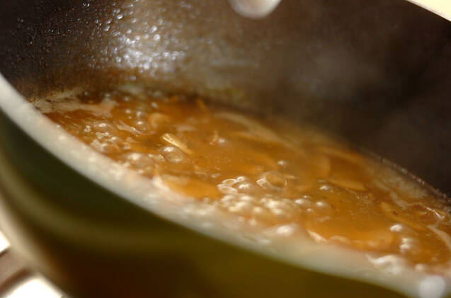 (1)のフライパンにバターとマッシュルームを入れてキツネ色になるまで炒める。白ワイン、水、顆粒スープの素、ウスターソースを加え弱火で5分程煮詰める。塩コショウで味を調え、分量外の少量の水で溶いた小麦粉を少しずつ加えてトロミをつける。