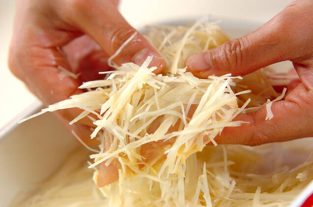 タラに塩コショウをし、混ぜ合わせた<衣>をつけ、ジャガイモをまんべんなくまぶす。