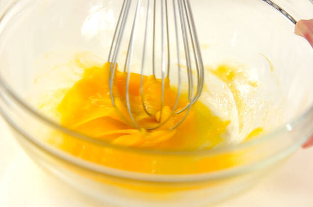 ボウルに全卵と卵黄を入れて溶きほぐす。