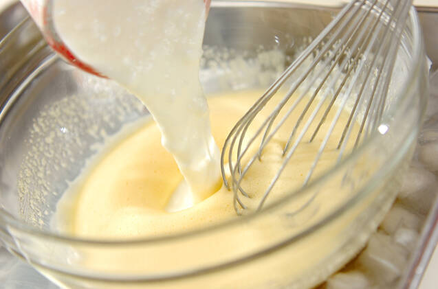 水気をきった板ゼラチン12gを湯せんで溶かし、4に加えよく混ぜ、氷水で冷やしながら粗熱を取り、プレーンヨーグルトを加えて混ぜる。