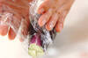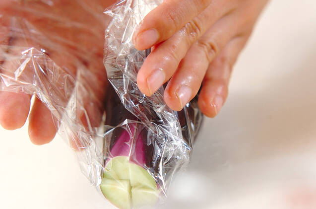 ナスはヘタを切り落として縦4つに切り、ラップに包んで電子レンジに3~4分かける。ラップを外し、粗熱が取れたら縦に細切りにする。電子レンジは600Wを使用しています。