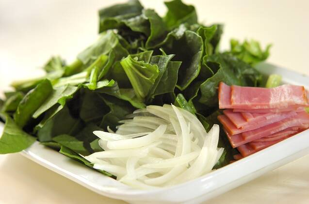玉ネギは薄切り、ベーコンは幅1cmに切り、ホウレン草は根元を切り落として、長さ2cmに切る。