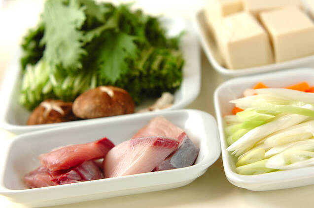 ブリはサッと水洗いし、皮をひいて2~3つに切る。豆腐は4つに切る。ニンジンは皮をむき、短冊に切る。白ネギは斜め切りにする。水菜は根元を2cmくらい切り落とし、きれいに水洗いして長さ4~5cmに切る。シイタケは汚れを拭き取って軸と笠に切り分け、軸は縦2~4つに裂き、笠は切り込みを入れる。