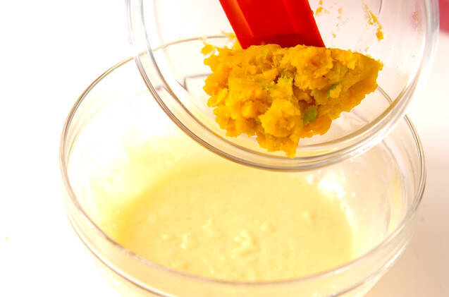 ラップを掛けずに電子レンジで3~3分30秒加熱し、しっかり混ぜ合わせて全体になめらかになったら、カスタードが熱い間にバターを加え混ぜ、生クリーム、バニラエッセンス、つぶしたカボチャを加えて更によく混ぜ合わせる。