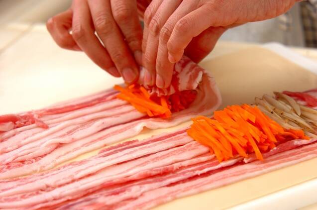 豚バラ肉は5枚ずつ少しずらして重ね、粗熱が取れたゴボウとニンジンを半量ずつのせて巻く(2個作る)。巻き終わりは両端からゴボウとニンジンが出ないように豚肉で覆うように形を整え、最後はしっかりとにぎって形を整える。