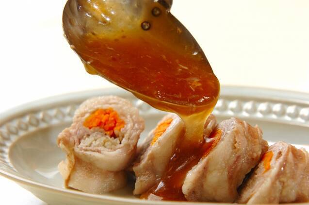 残った<合わせだし>を鍋に入れて強火にかけ、煮たったら<水溶き片栗>を少しずつまわし入れてトロミをつける。豚肉ロールを食べやすい大きさに切って器に盛り、<合わせだし>をかけてキヌサヤを添える。