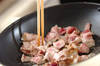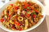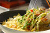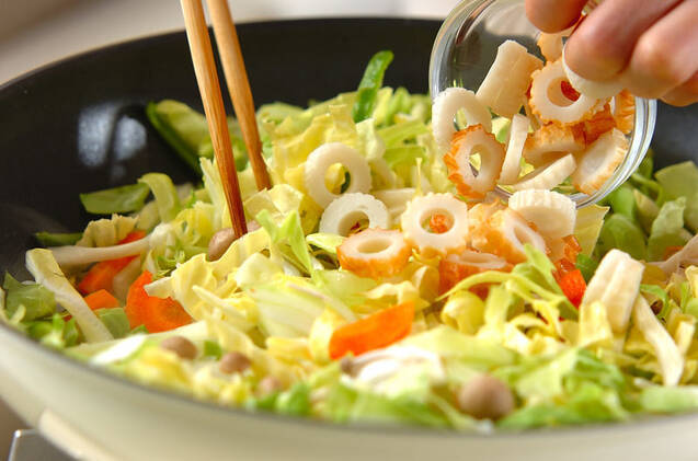 野菜、ちくわを炒め、しんなりしたらいったん取り出し豚バラ肉と合わせる。