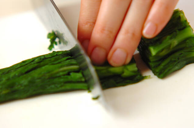 春菊は根元を特にきれいに水洗いし、熱湯でサッとゆでて水に取る。粗熱が取れたら水気を絞り、長さ3cmに切る。