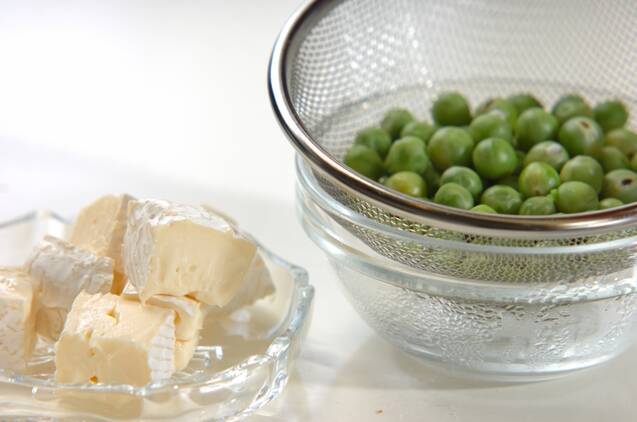 エンドウ豆はサヤから出してサッと塩ゆでし、ザルに上げる。カマンベールチーズは2cm角に切る。ボウルに<調味料>の材料を混ぜ合わせる。