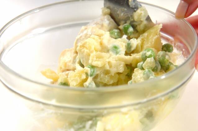 エンドウ豆と新ジャガイモが熱いうちに、<調味料>のボウルにカマンベールチーズと一緒に混ぜ合わせ、器に盛る。